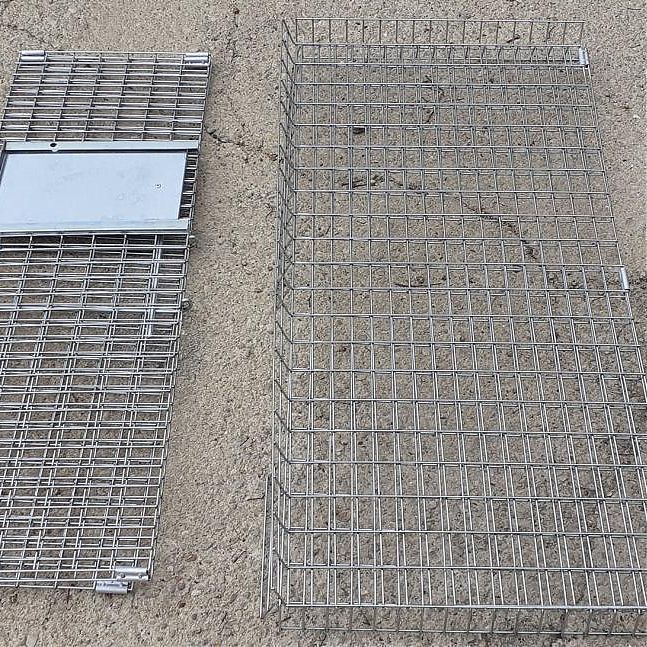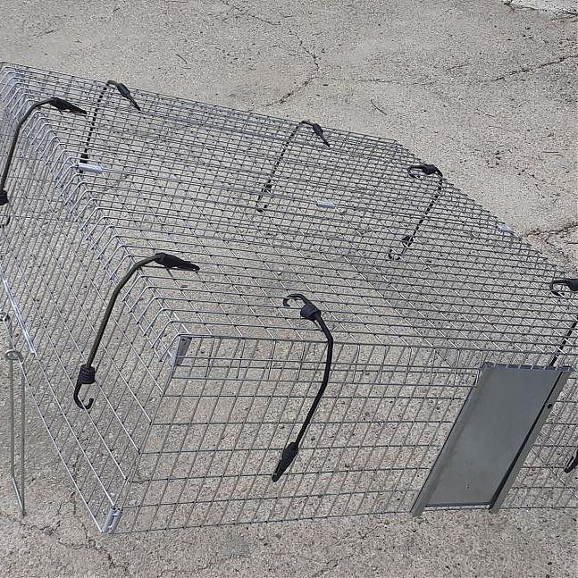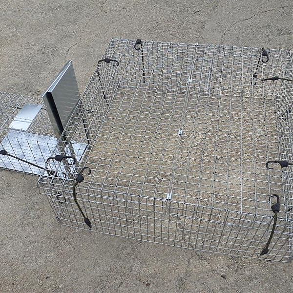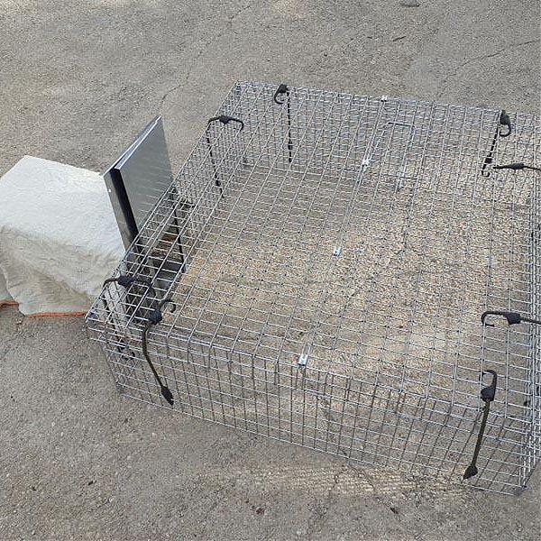 (PRODUCTO AGOTADO TENDREMOS STOCK EN 15 DÍAS)Trampa manual para la captura de gatos(Drop Trap). También se puede utilizar como trampa estática multicaptura. Medidas de la trampa montada 100x100x35 cm. Plegable en dos piezas independientes de medidas 100x50x10 cm. Peso de las piezas: 5,6 kg las paredes y 4kg el techo, con un total de 9,6 kg el conjunto montado. Luz de los cuadros de la malla con la que está construida la trampa 2,8cm x 4,5cm. Se manda plegada. En este artículo no se suministra la cuerda para tirar. La jaula transportín REF06 de traspaso NO se incluye con la compra de la trampa manual REFN00. PRECIO CON IVA Y ENVÍO INCLUIDO.